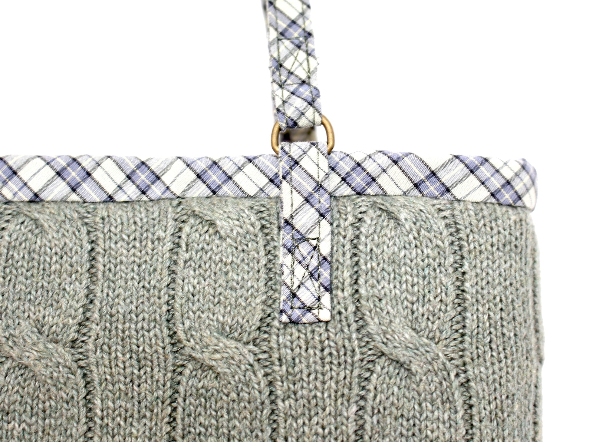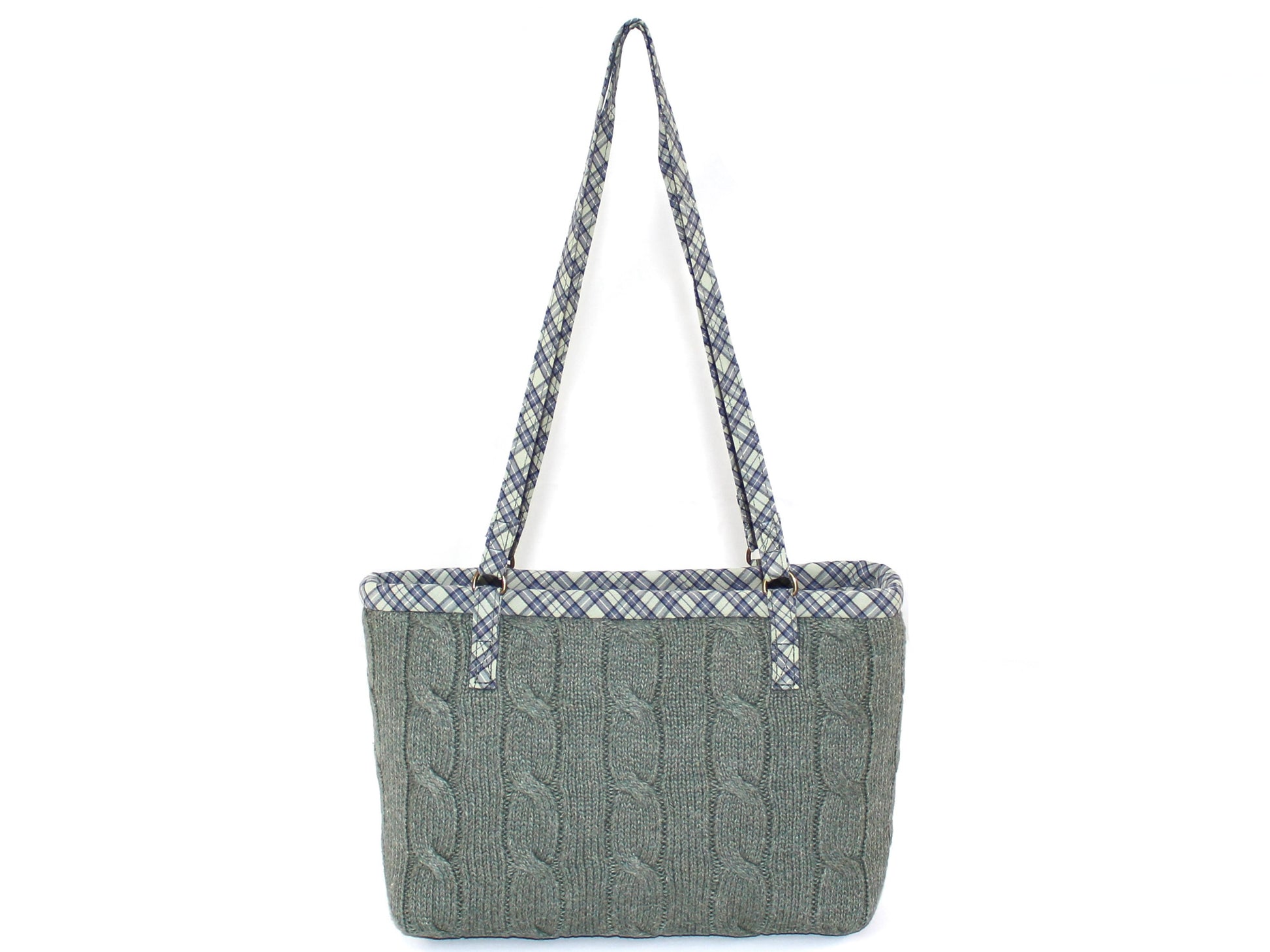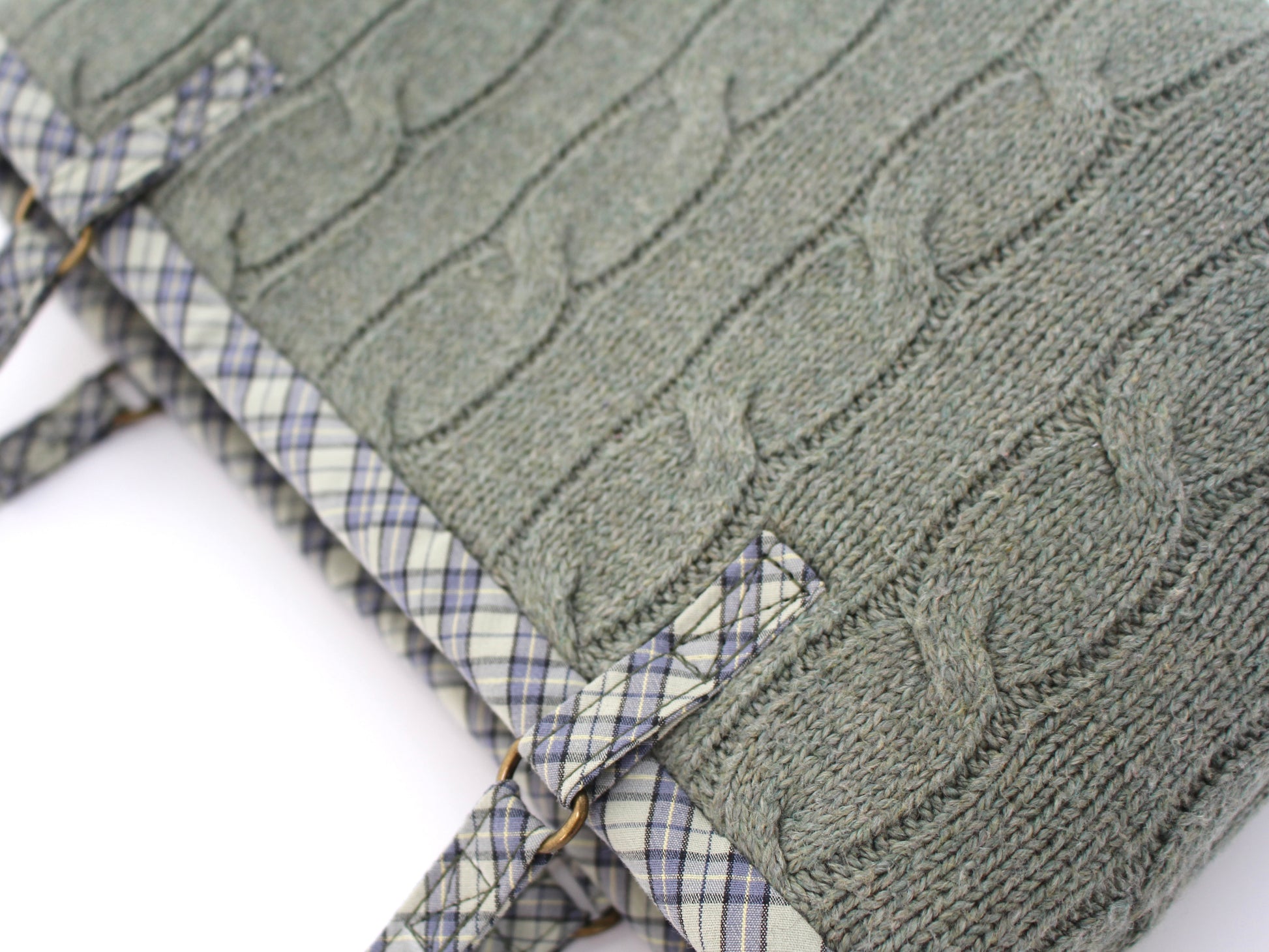 This Cable Knit Sweater Shoulder Bag is thoughtfully crafted from upcycled 100% cotton sweater material, combining sustainability with style. Lightweight yet structured thanks to a foam stabilizer, it features a durable metal zipper top for secure closure. The bag includes interior pockets for convenient organization and is accented with cotton plaid lining and straps in sage green, offering a refined, classic look. Its design balances practicality and eco-friendly craftsmanship, making it a sophisticated choice for everyday use.