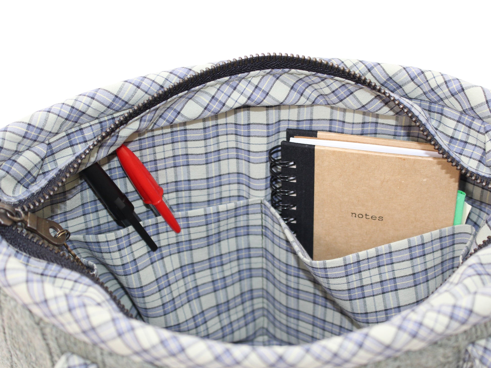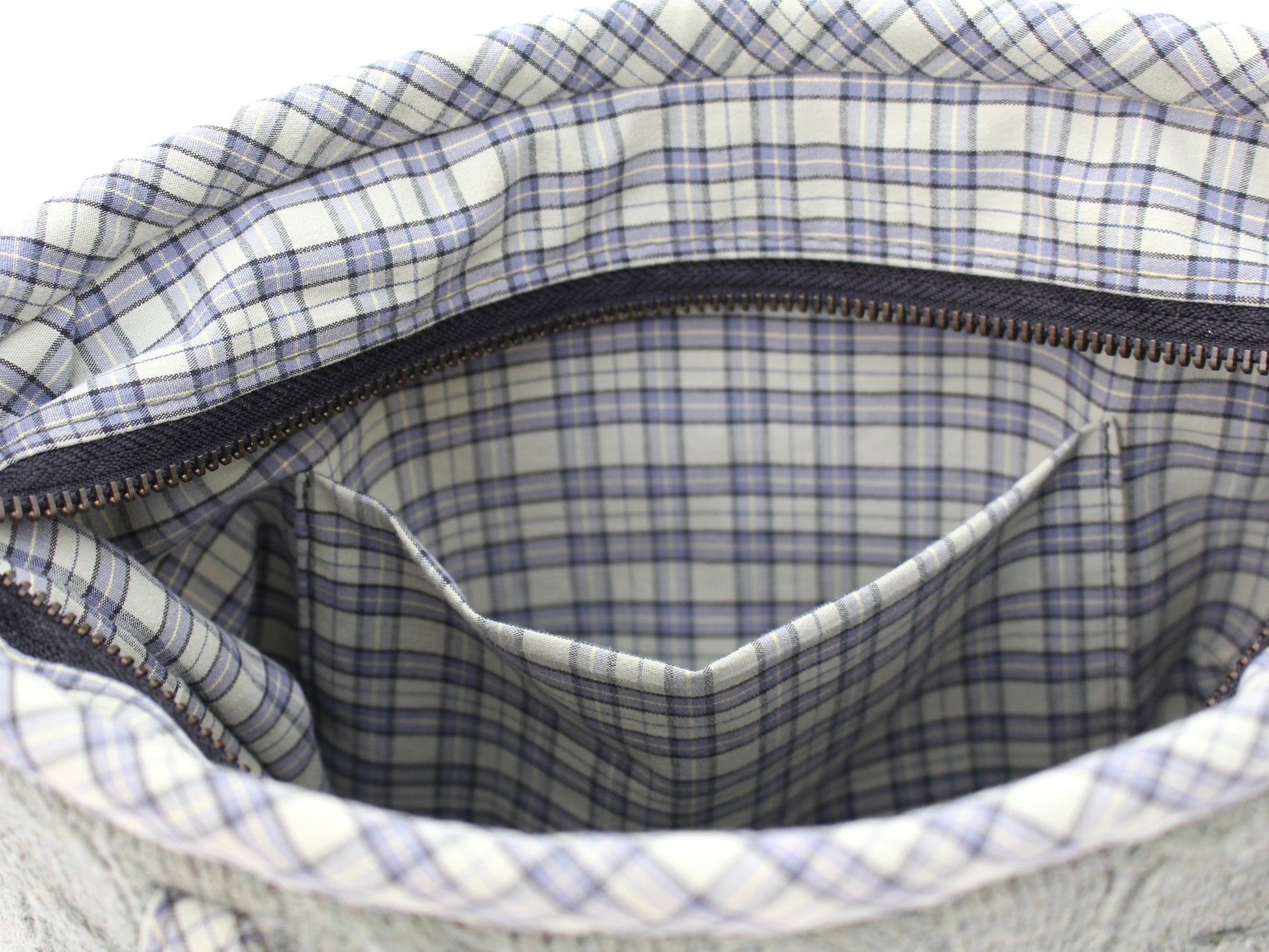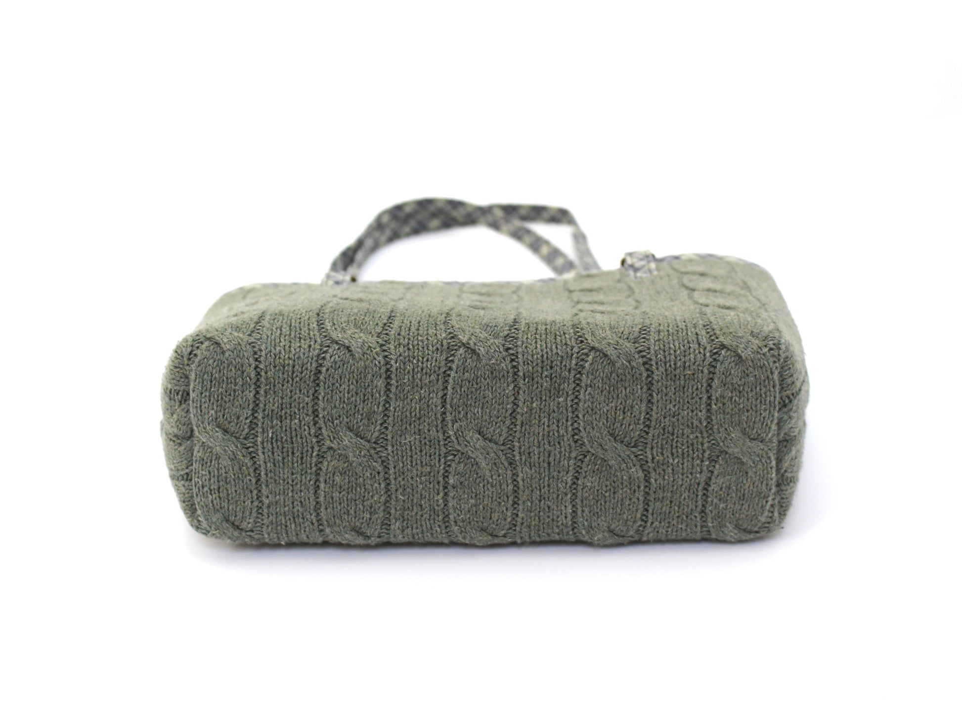 This Cable Knit Sweater Shoulder Bag is thoughtfully crafted from upcycled 100% cotton sweater material, combining sustainability with style. Lightweight yet structured thanks to a foam stabilizer, it features a durable metal zipper top for secure closure. The bag includes interior pockets for convenient organization and is accented with cotton plaid lining and straps in sage green, offering a refined, classic look. Its design balances practicality and eco-friendly craftsmanship, making it a sophisticated choice for everyday use.