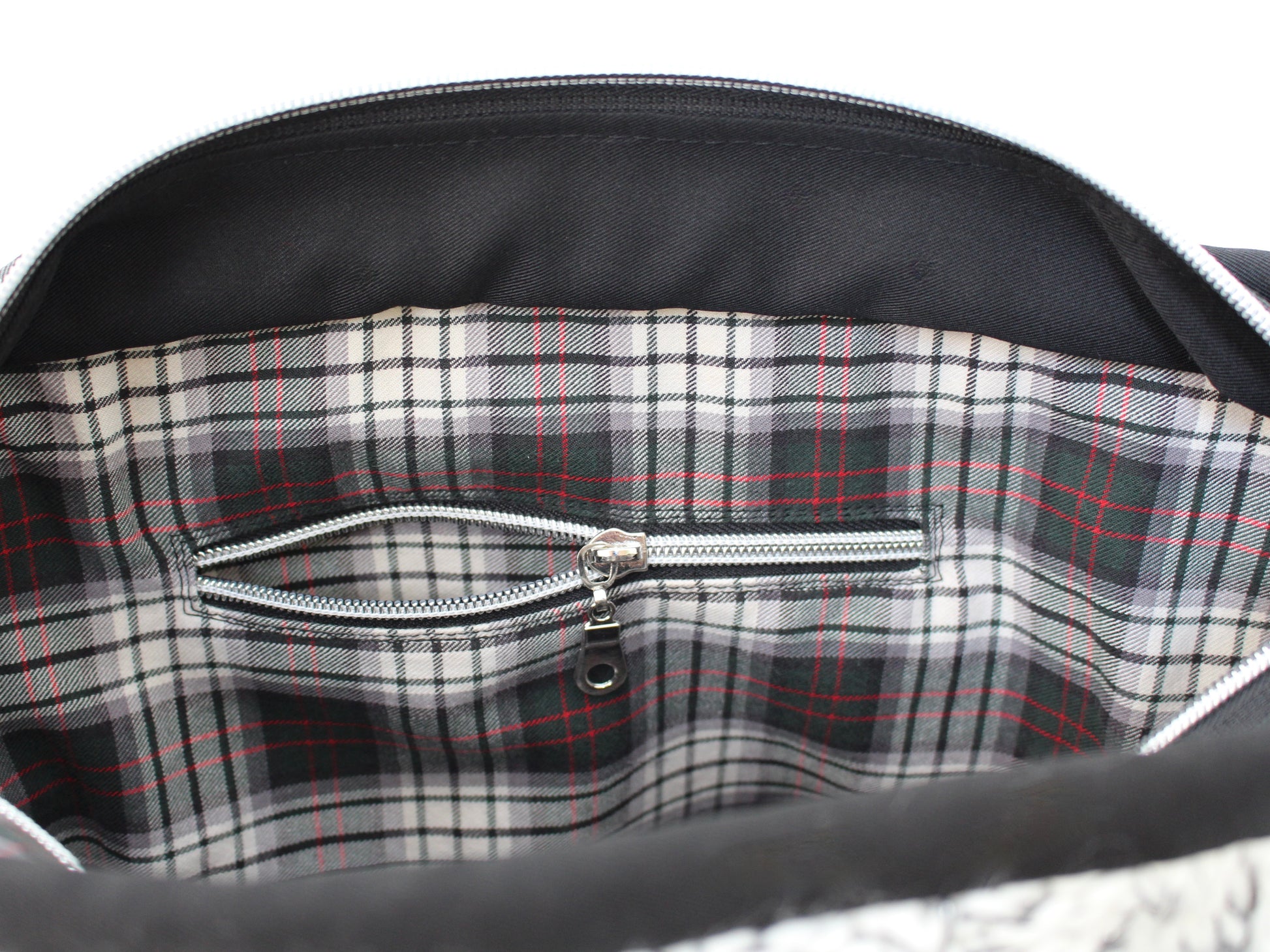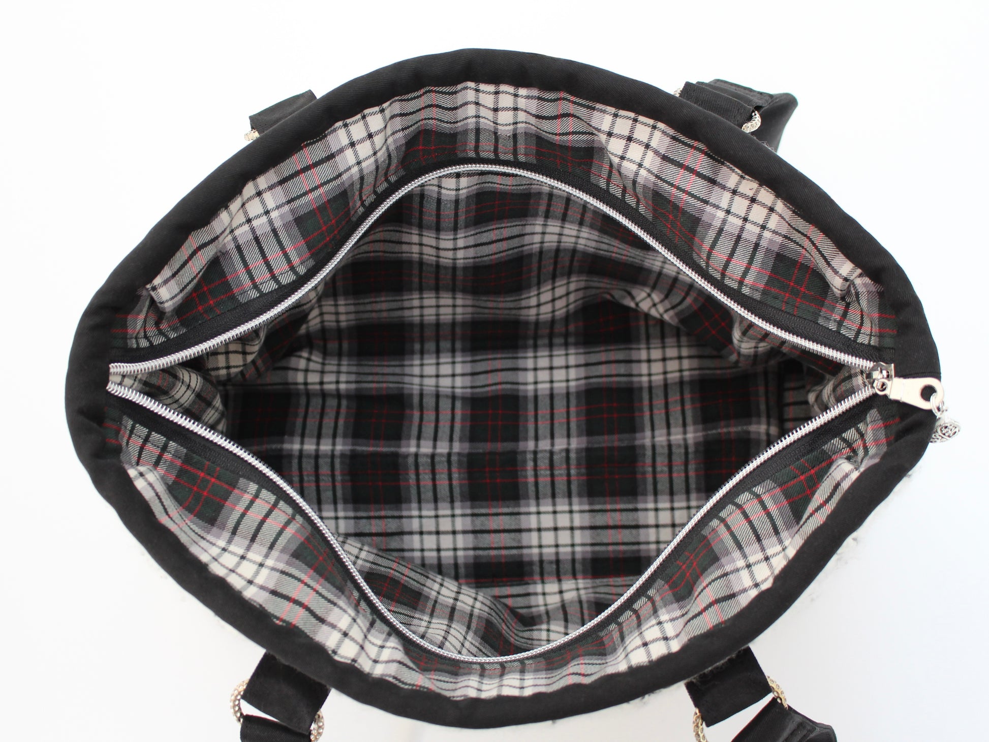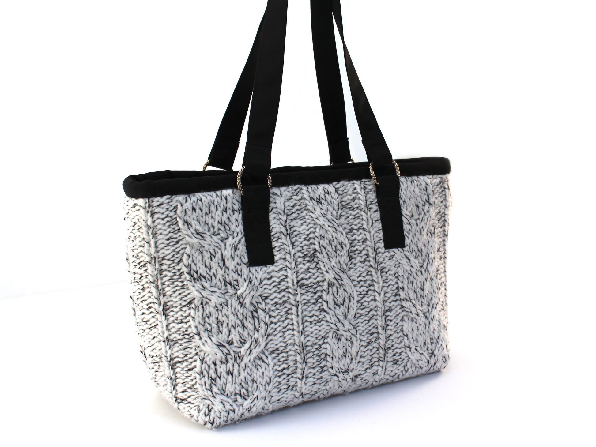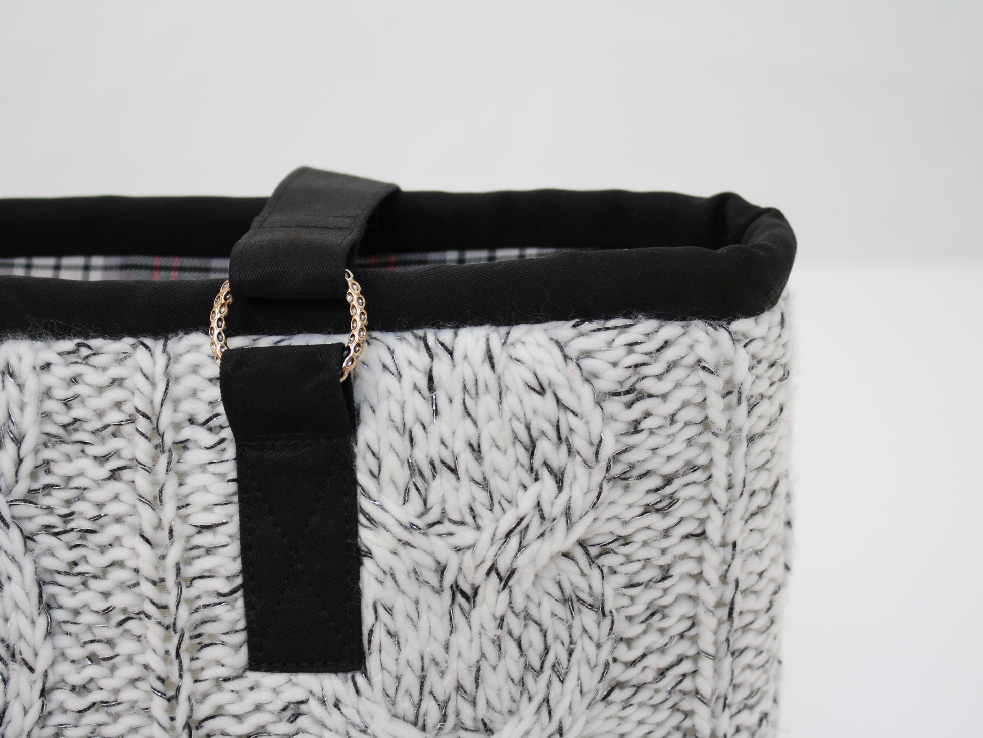 This Cable Knit Sweater Shoulder Bag blends sustainability with refined design. Crafted from upcycled acrylic cable knit, woven with silver metallic threads that add subtle shimmer. The interior boasts an upcycled cotton plaid lining, complemented by durable upcycled woven polyester straps for comfortable wear. Practical details include a lightweight foam stabilizer for structure, an interior zipper pocket, and a patch pocket perfect for a phone. A nylon metallic-look zipper with a charm secures your belongings, making this bag both stylish and functional.