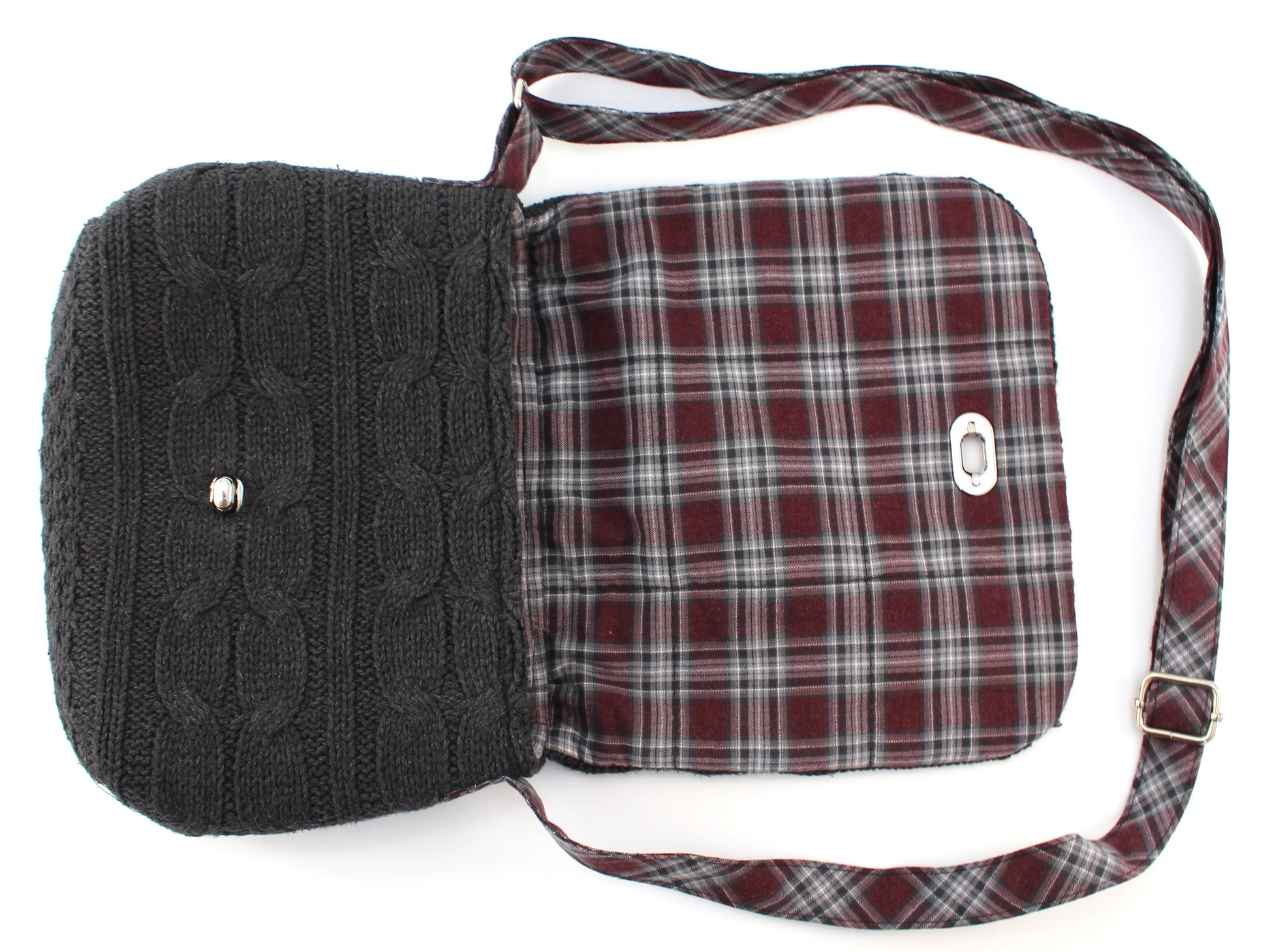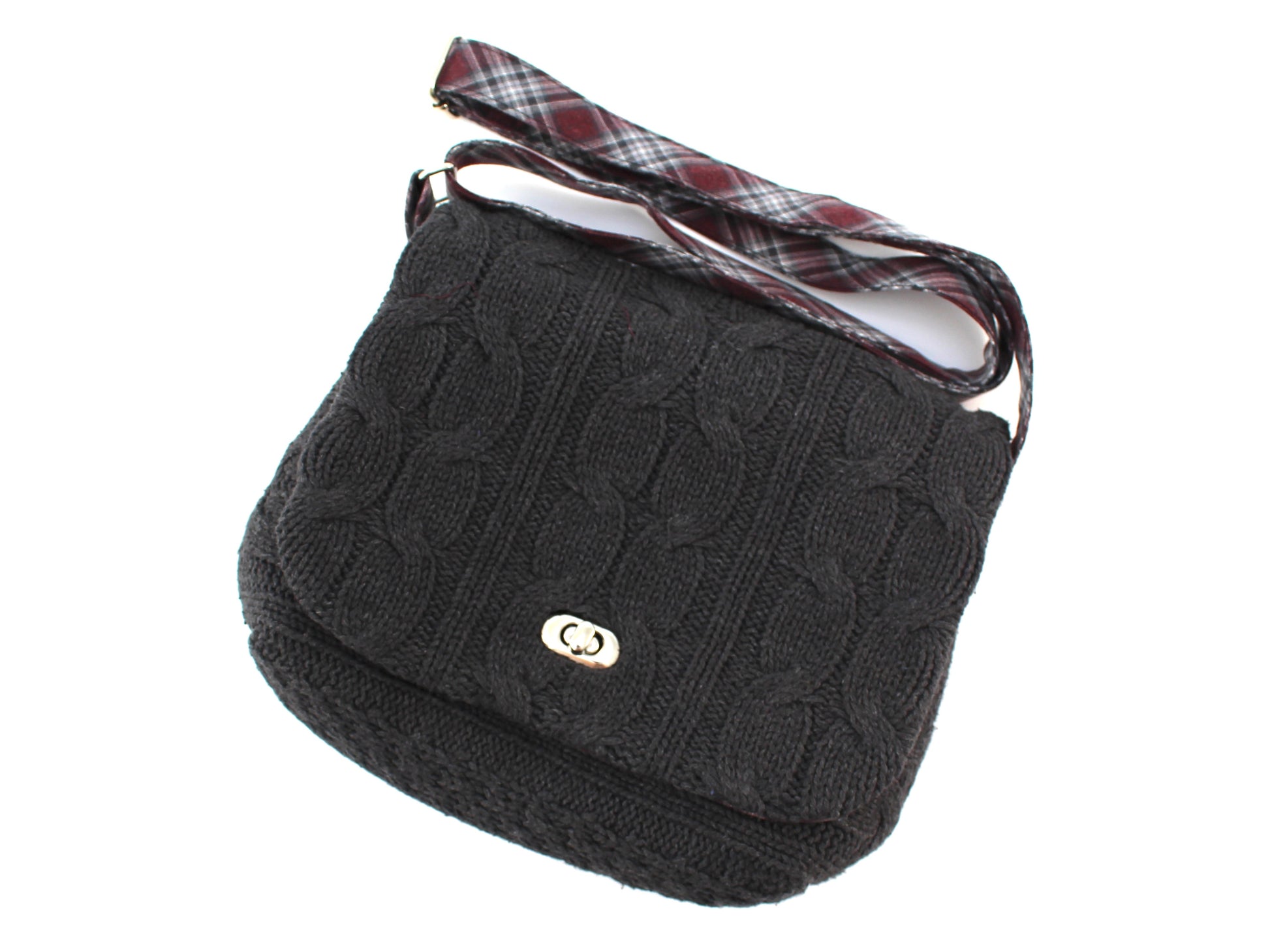 Crafted from upcycled cotton cable knit with a soft cotton flannel lining, this lightweight Crossbody Cable Knit Sweater Purse combines sustainable materials with durable design. It features an adjustable strap with a metal slider for a customized fit and a secure metal turn lock clasp closure. A foam stabilizer inside provides structure while maintaining a comfortable shape. Easy to maintain, simply spot clean as needed. Note that colors may vary slightly due to screen differences. This purse is a refined choice for eco-conscious style and daily functionality.