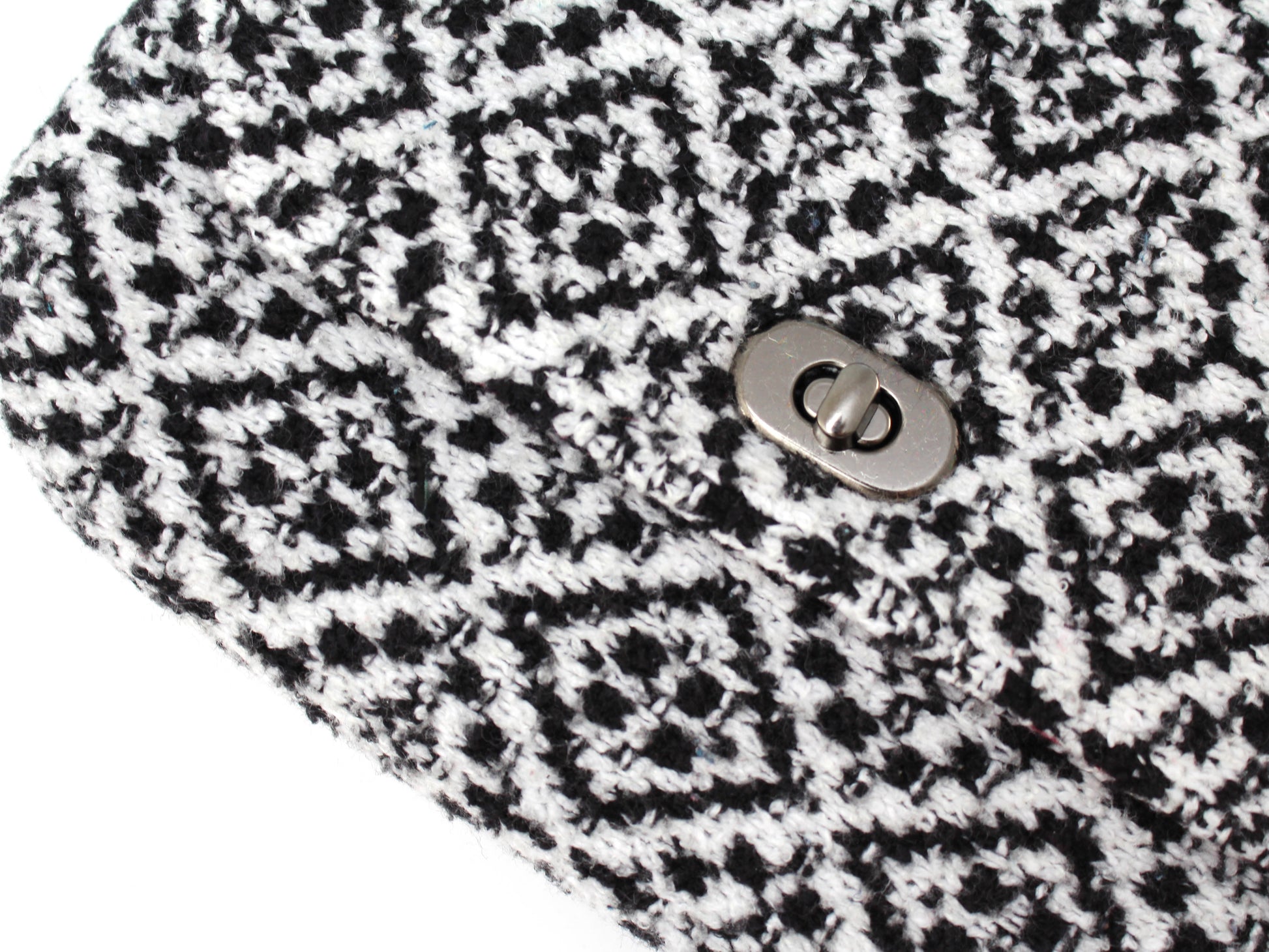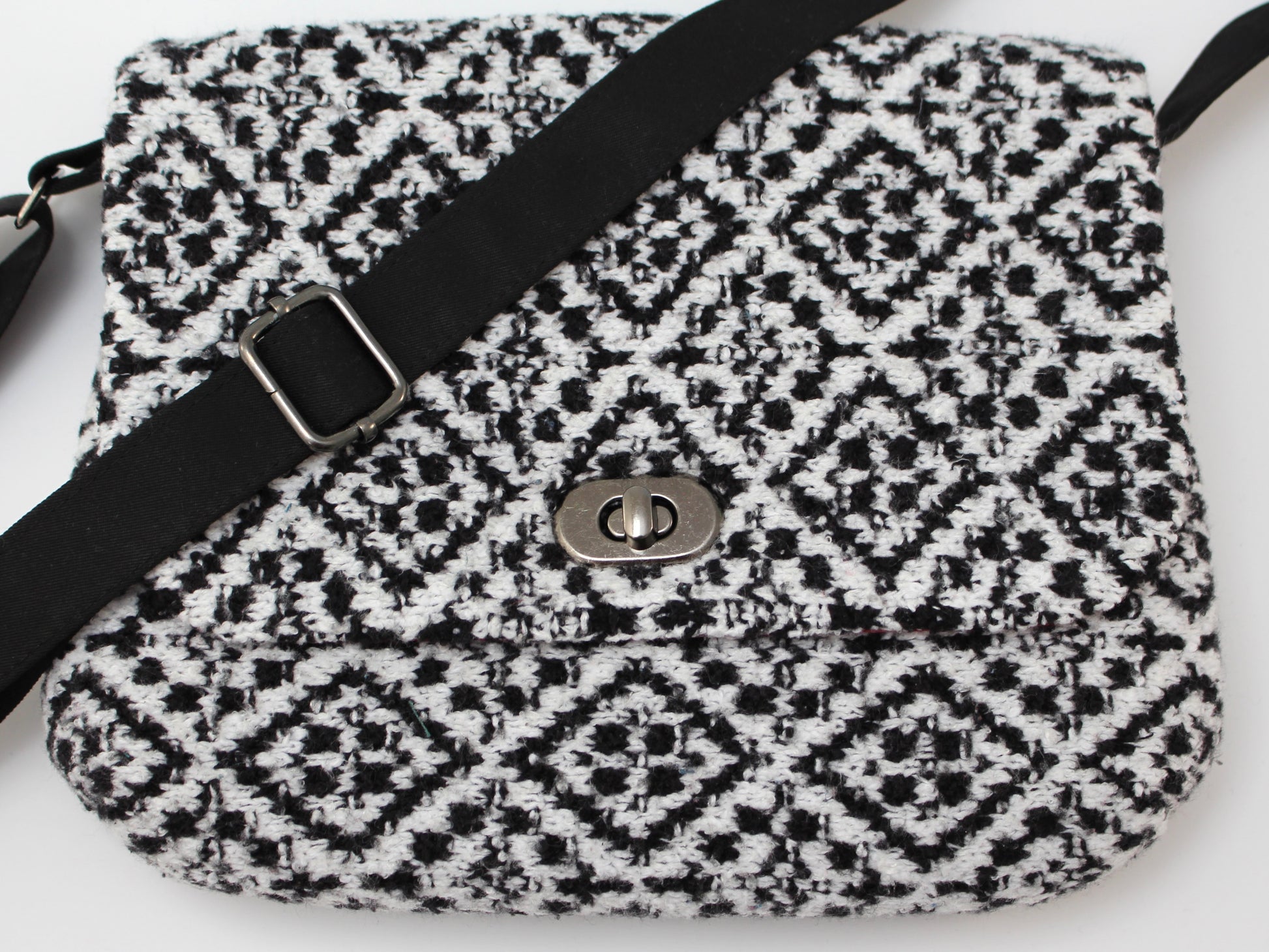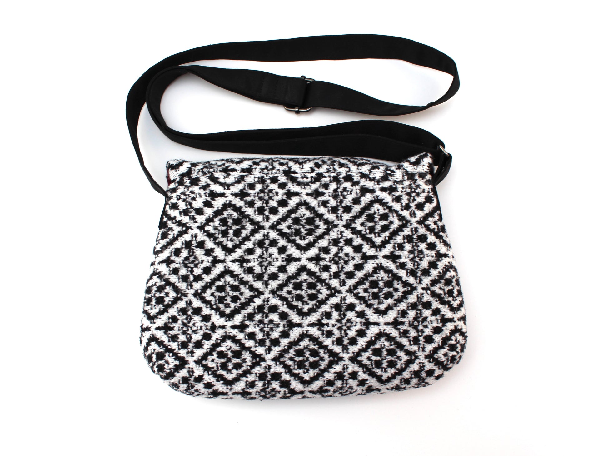 This Crossbody Sweater Purse showcases an upcycled acrylic sweater exterior paired with a cotton burgundy marble pattern lining. It features an adjustable strap crafted from upcycled cotton twill, equipped with a metal slider for personalized fit and a metal turn lock clasp for secure closure. Lightweight yet structured, a foam stabilizer provides shape without added bulk. For maintenance, spot clean as needed to preserve its quality and appearance.