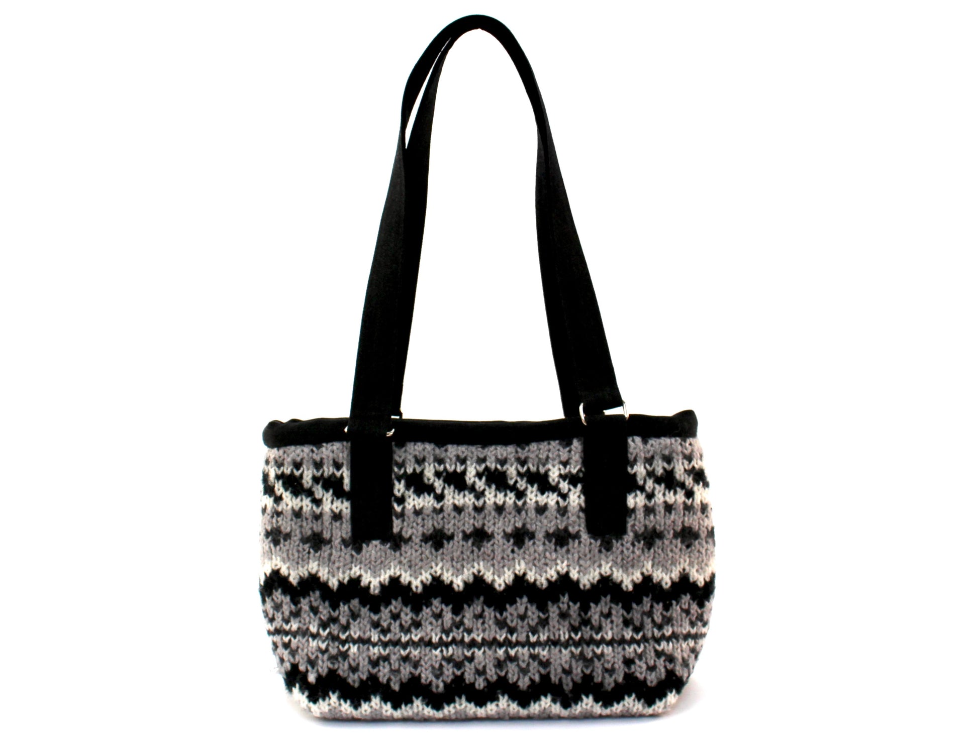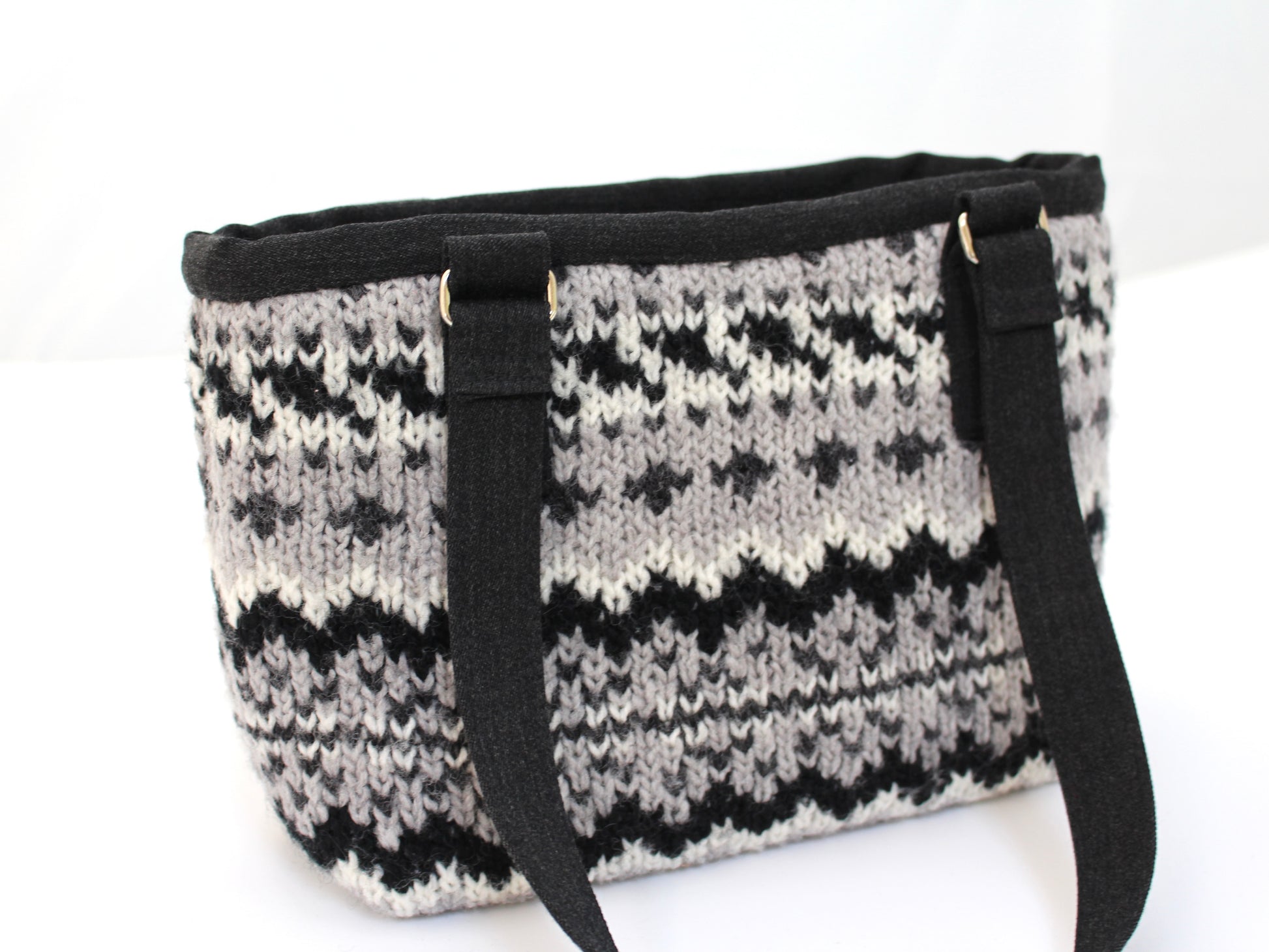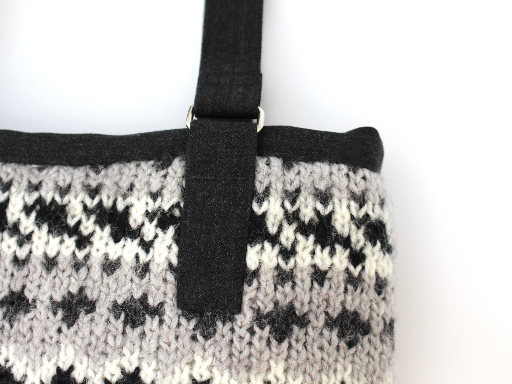 This bag is one of a kind, designed with upcycled and new materials. The body of the bag is upcycled 80% acrylic, 10% wool, 10% polyester sweater fabric. Lining is a cotton plaid in gray, black and burgandy. Handles and zipper top are upcycled 55% polyester, 45% wool suiting fabric, attached with metal rings. The metallic-look nylon zipper features a decorative metal owl charm. Foam stabilizer gives structure to the bag, allowing it to stand on its own, while still bendable. The base is reinforced with foam-backed vinyl under the lining (not visible, sewn inside).