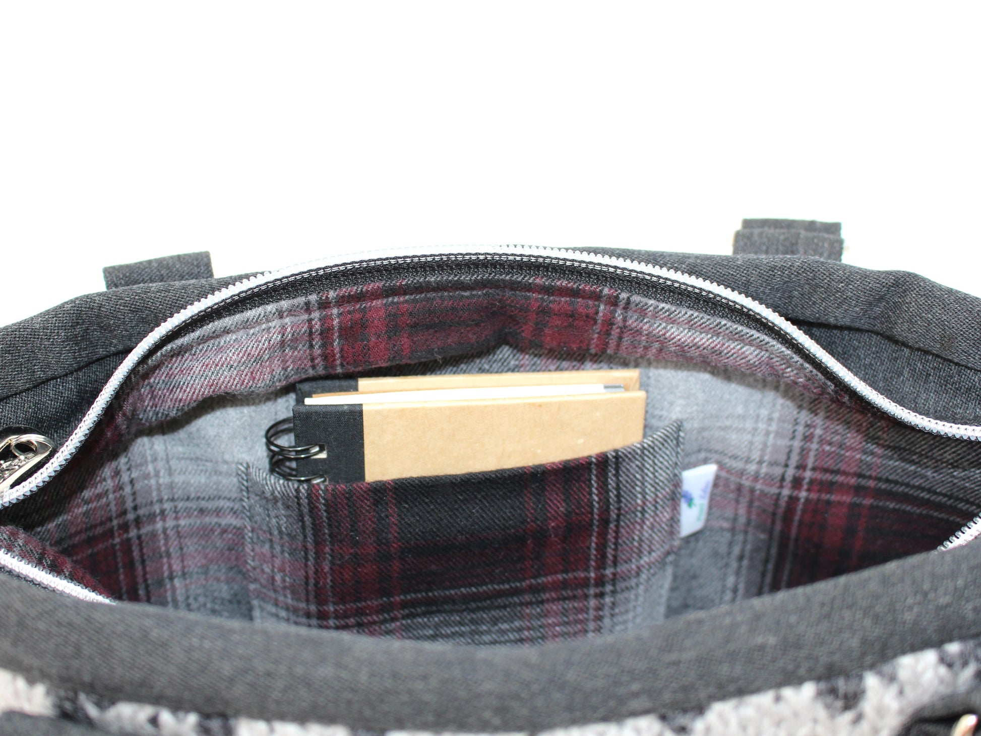 This sturdy handbag is made from an upcycled sweater knit, upcycled wool blend suiting fabric and upcycled plaid cotton fabric. A zipper top keeps the contents of your bag inside. The interior of the bag has two pockets, a zipper pocket on one side and a patch pocket on the other.