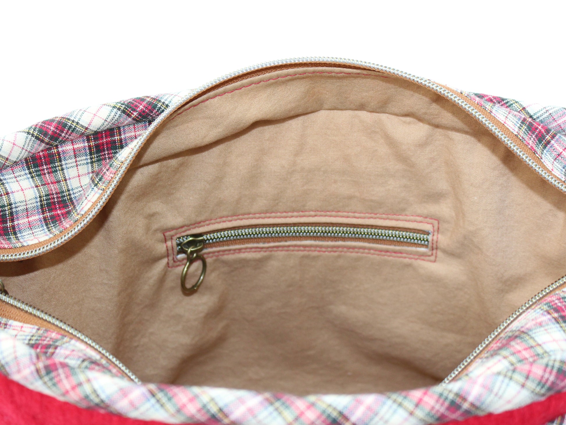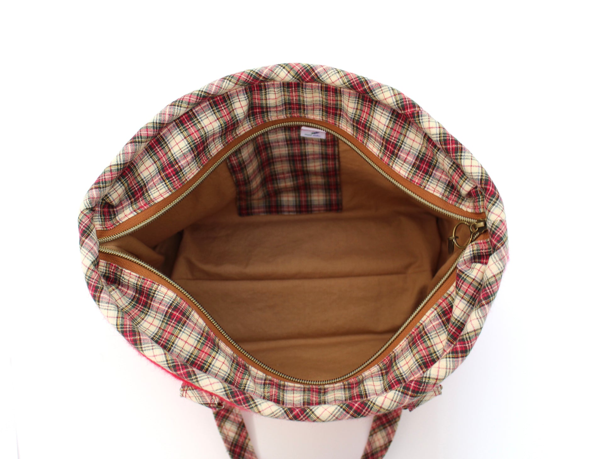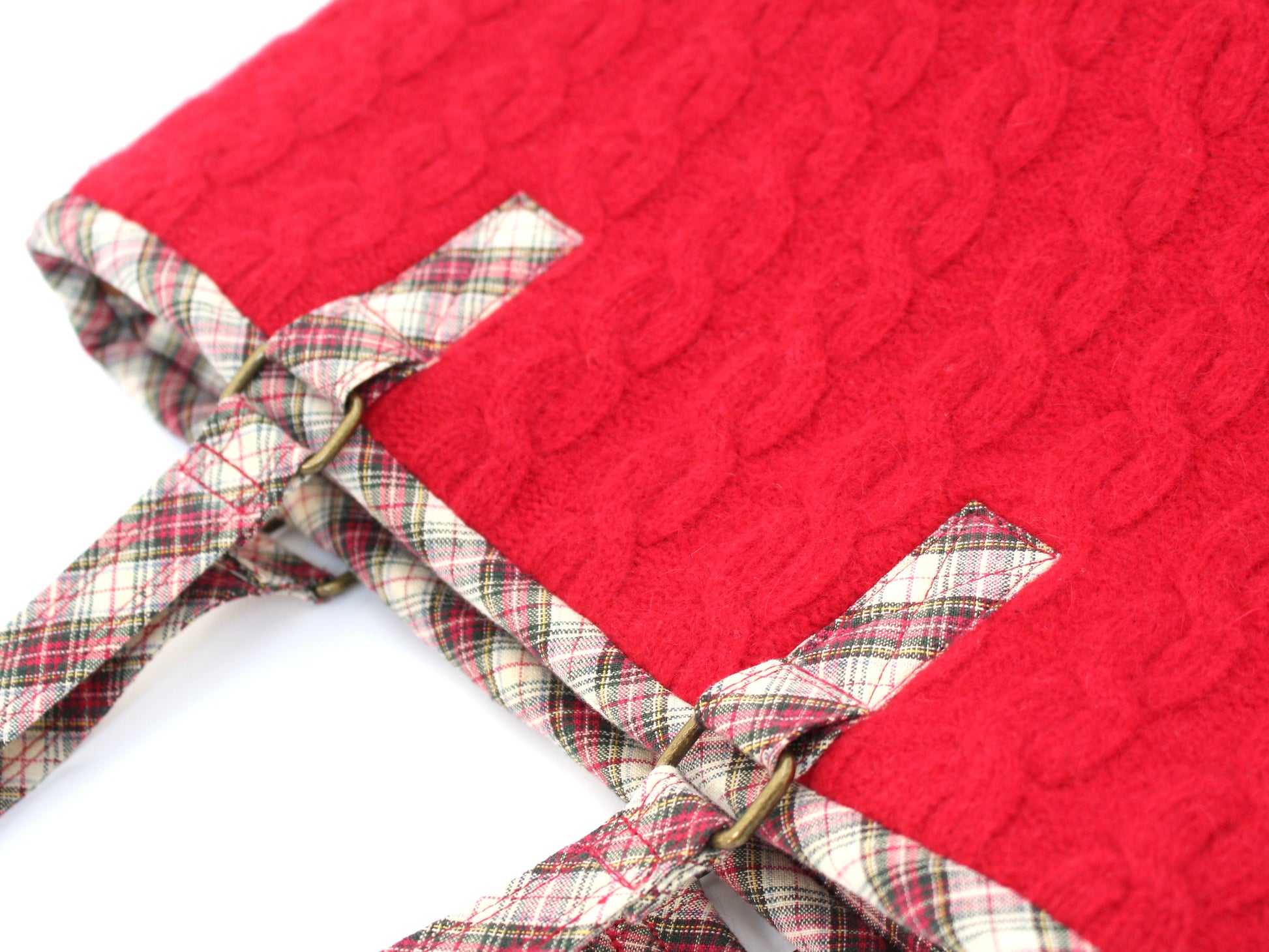 Crafted from upcycled materials, this Wool Cable Knit Sweater Handbag features a durable blend of 70% lambswool, 20% angora, and 10% nylon for a textured, cozy finish. Its upcycled cotton plaid straps combine style and sustainability, while the cotton lining ensures comfortable, lightweight interior organization. Practical details include an interior zipper pocket and a patch pocket sized for your phone. A nylon zipper secures the main compartment, and an internal foam stabilizer maintains the bag’s structured shape. Spot cleaning is recommended to preserve its quality. Note that colors may vary slightly on screens.