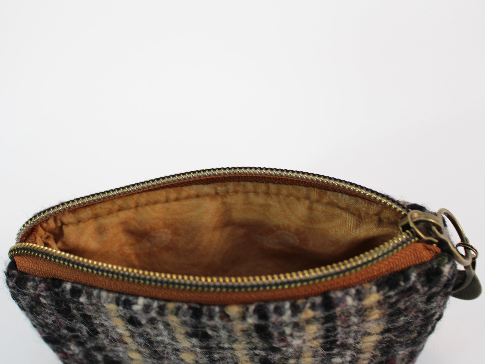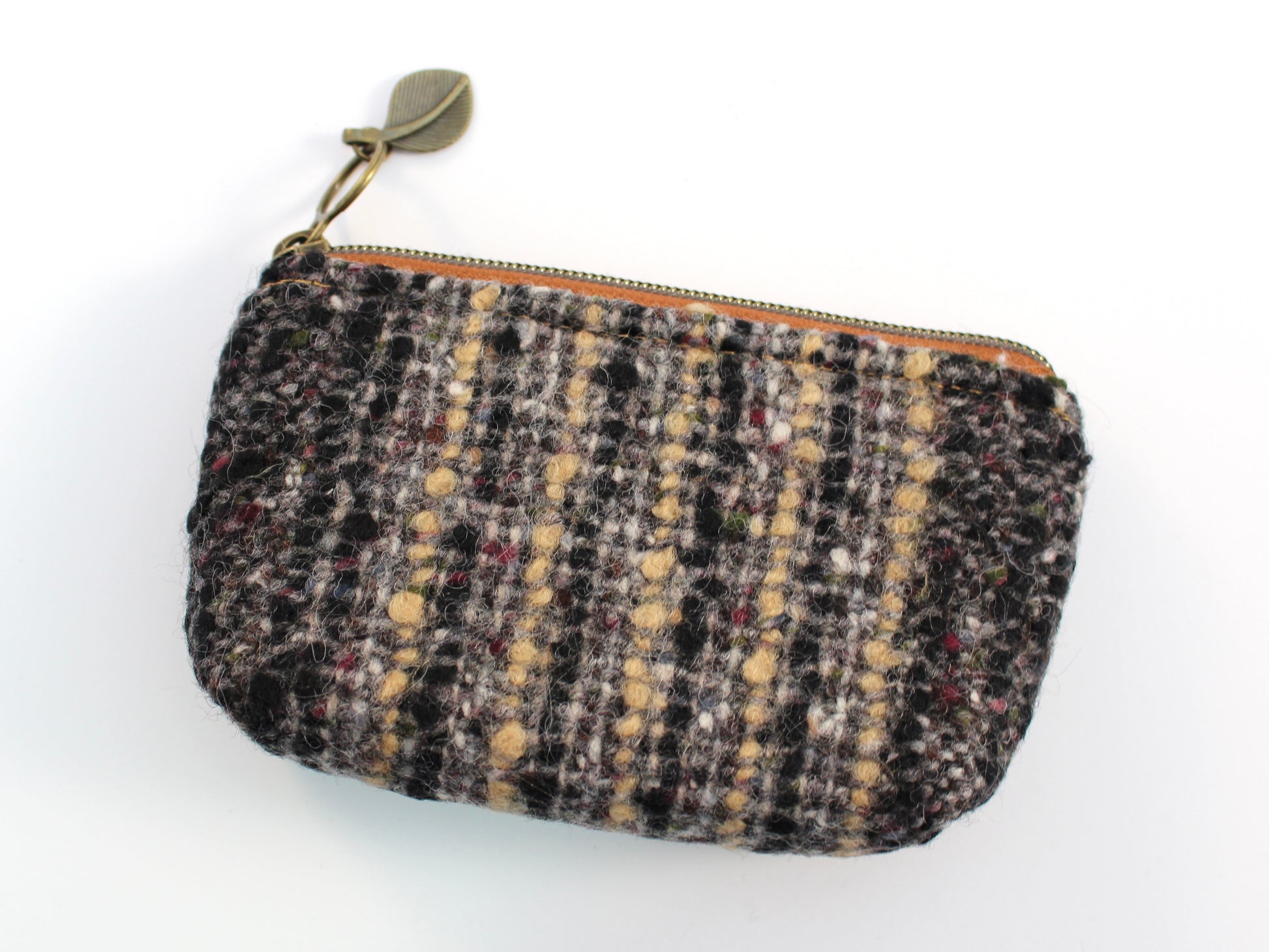 Crafted from upcycled woven wool blend, this coin purse offers durability and a unique textured finish. The interior features a soft upcycled cotton fabric lining, providing gentle protection for your coins and other small items. A nylon zipper with a leaf charm ensures secure closure while adding an elegant detail. Lightweight and reinforced with a foam stabilizer, the purse maintains its shape without added bulk. Designed for practicality and sustainability, it is best maintained by spot cleaning as needed.
